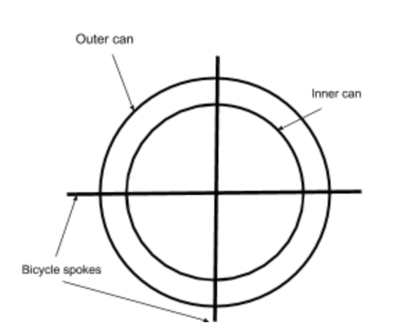 The calorimeter was created using two metal soda cans, one being wider than the other (1 Izzy can, 1 Diet Coke can). Four holes were poked in each can, evenly spaced near one end, top or bottom, using a handheld drill with a thin drill bit from the I-lab. Two bicycle spokes, the temperature resistant rods, were then put through both cans so that the thinner can was suspended within the wider one (Fig. 1).