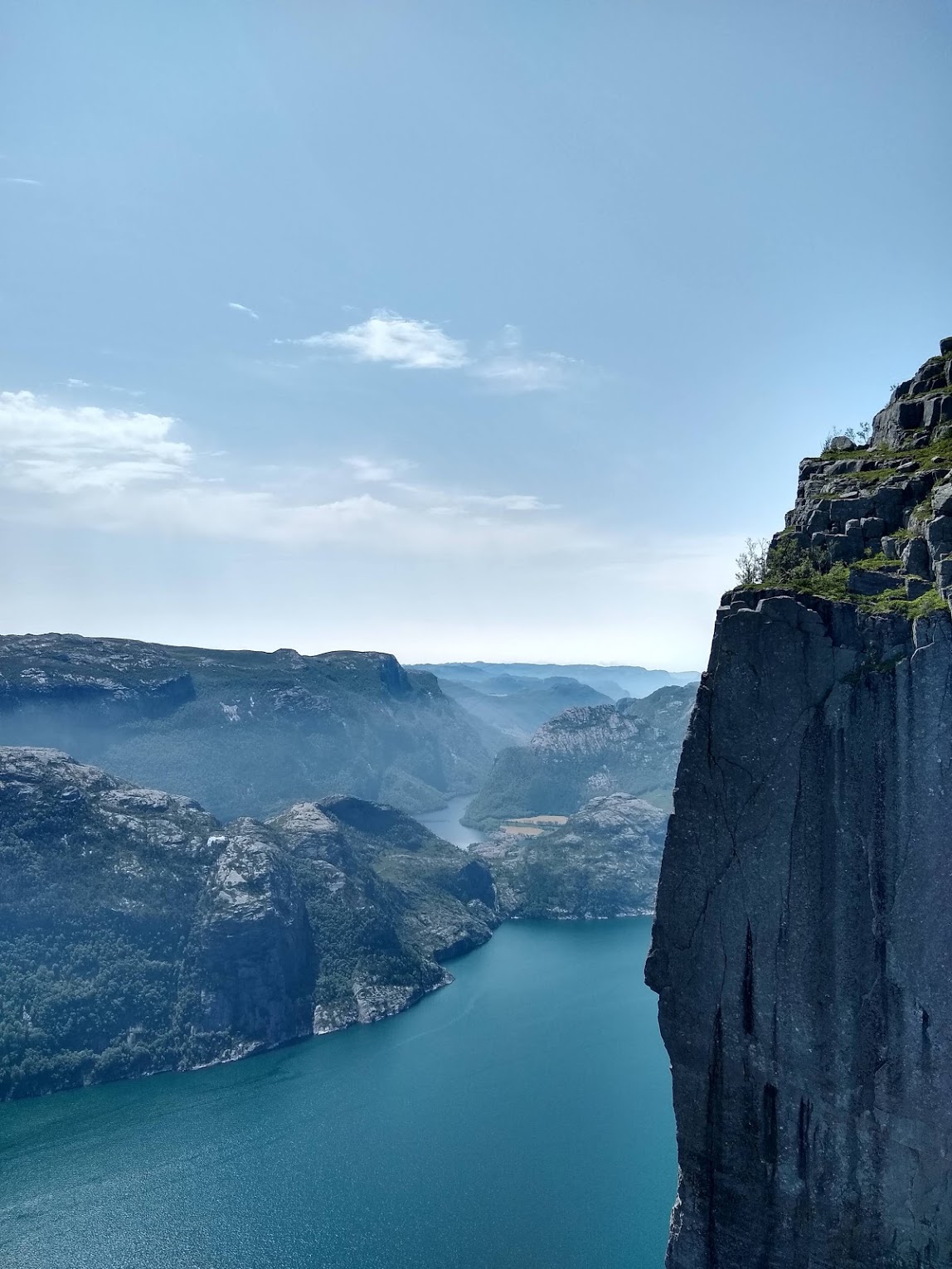 We had to wake up earlier today, which kinda sucked. We layered up, ready for a day outside, and after our scrambled eggs we walked the 5-minute walk to the ferry. Our tour people, GoFjords, directed us to the area where the boat would land, and we waited for almost 15 minutes before it came. Honestly, we could have slept a little longer. When I had gone to Puerto Vallarta last spring I had gotten sick during a cruise; thankfully, that didn’t happen this time. The boat was too big and the water smooth enough that I felt nothing. The views were amazing, and during the time I had different relatives call me from their time zones to wish me a happy birthday. After the boat, we took a bus up the island and stopped at the base of Pulpit Rock. There is a restroom there, but it is the only one – after that, nature. My mom and sister rented out a set of hiking poles since my mom didn’t bring here from home, and we started. 2.5 hours, mostly uphill, as the weather got progressively hotter. We shed layers one by one like a lizard shedding its skin – first my jacket, then vest, then pants so I was just in leggings. My family had done the same. We were wanting, sweating, and our legs ached, mine more since I hike faster than the rest. Around us, other people hiked, in tank tops and sports bras or even shirtless. The path was rocky – we were bouldering more than anything. It got hotter and hotter, and we stopped numerous times to take photos. It was incredibly scenic and I loved it, no matter the work. I suggest drinking water the entire time (I used my Camelback) and taking deep breaths. We reached Pulpit Rock at noon. A large cliffside