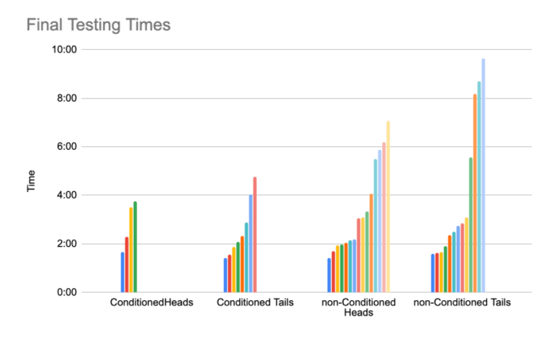Figure 4: The average times of heads, both conditioned and unconditioned, versus tails, both conditioned and unconditioned. The y-axis is time in minutes, and the x-axis is the two categories of planaria.